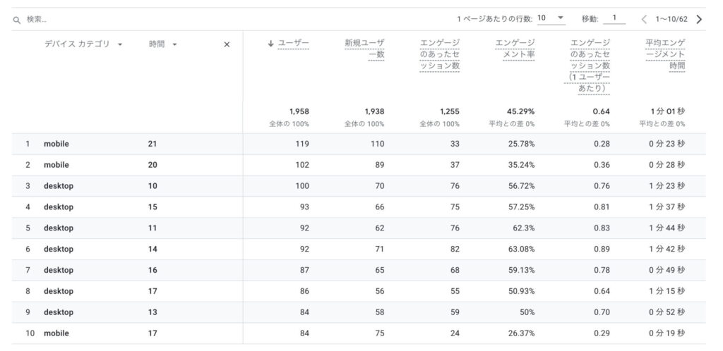 デバイスカテゴリと時間を掛け合わせたデータが表示されました。